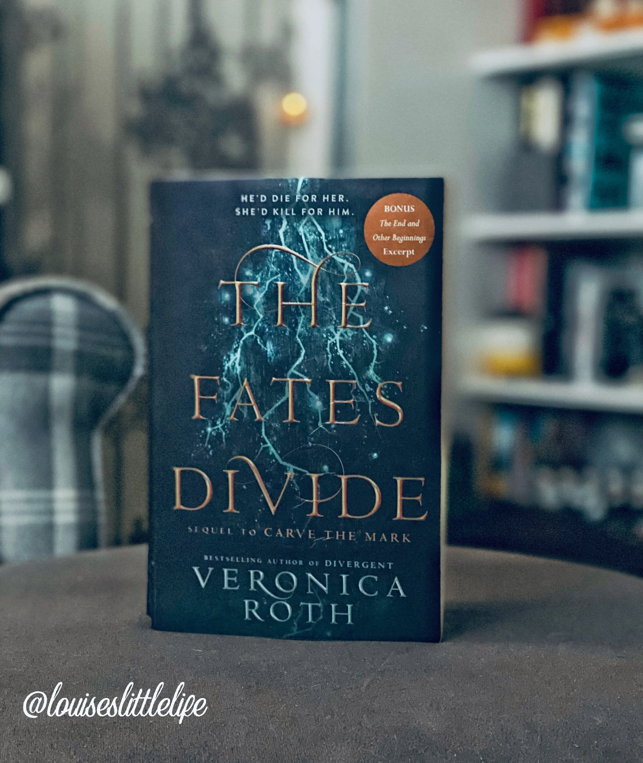 ID: The book The Fates Divide. It has a blue/green cover with an illustration that looks similar to lightning behind the title.