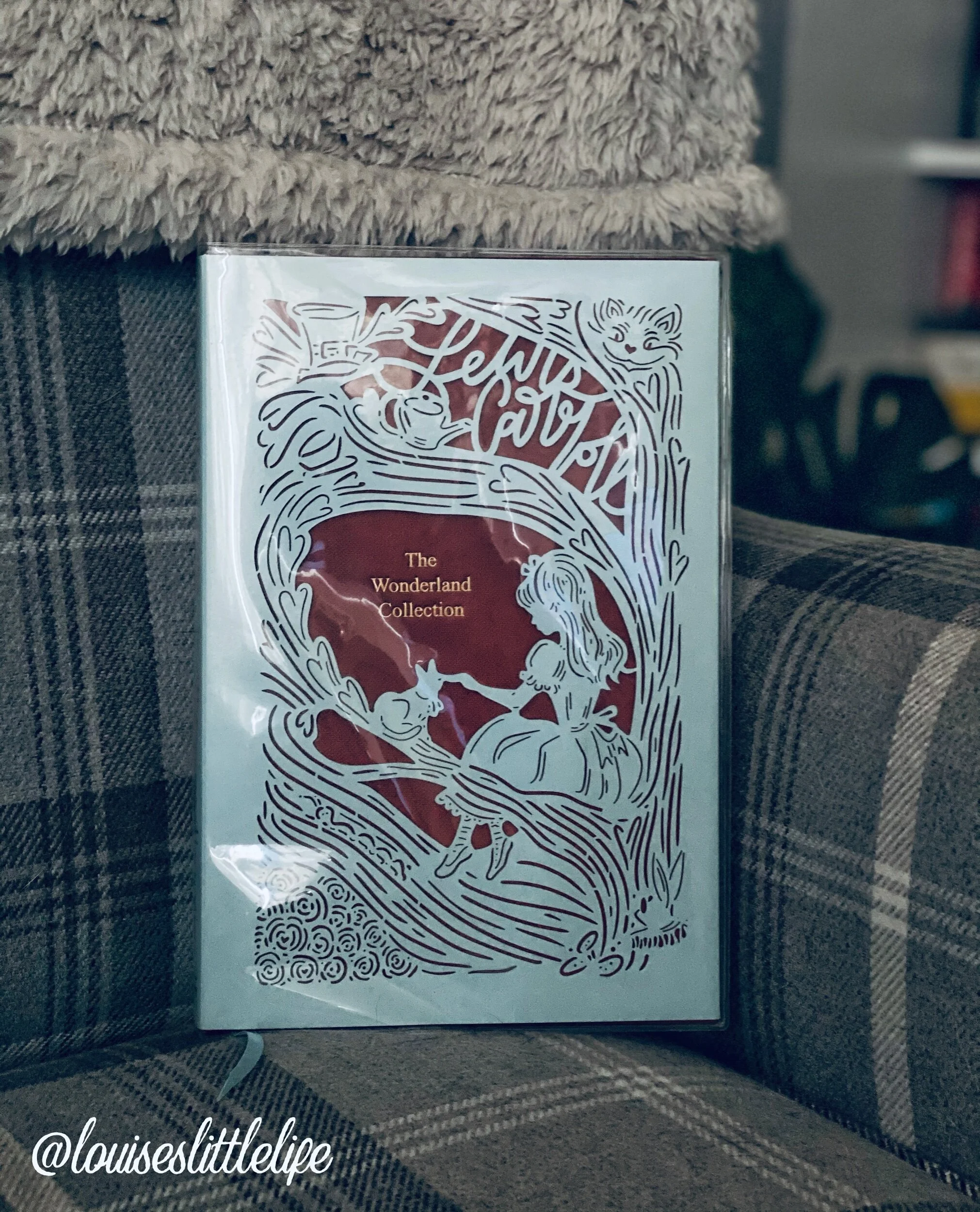 ID: The book The Wonderland Collection. It has a light blue cover with a laser cut design in it of Alice sat in a tree.