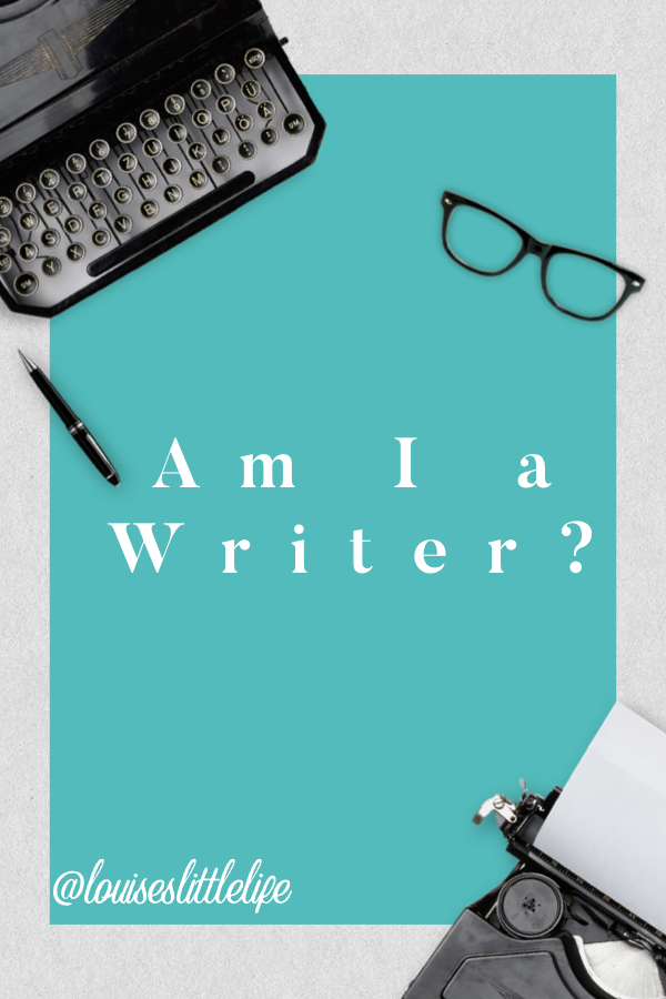 ID: A graphic with a blue/green background. with a picture of two typewriters, a pen and a pair of glasses. In the middle are the words “Am I a Writer?”