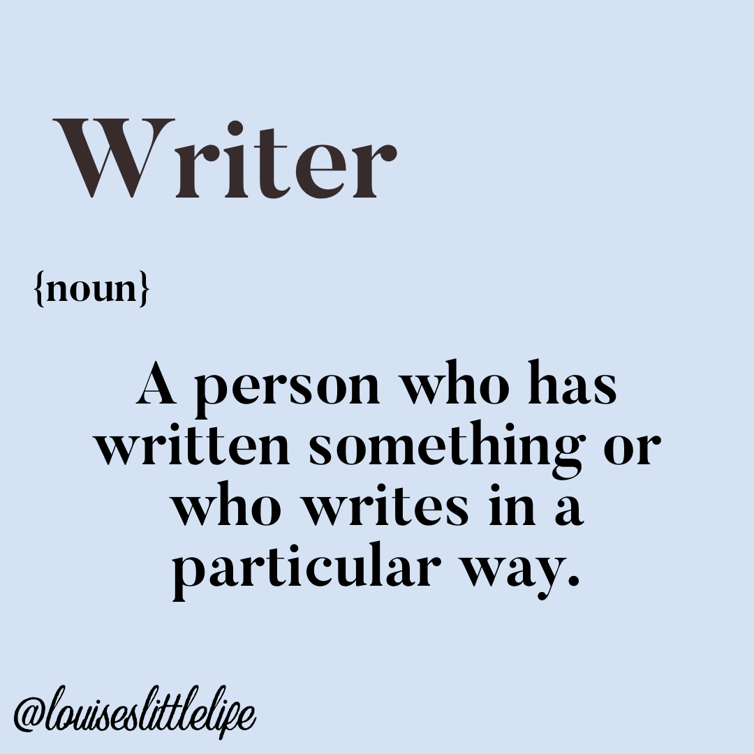 ID: A graphic with a light blue background and the words: “Writer {noun} A person who has written something or who writes in a particular way” in black on it.