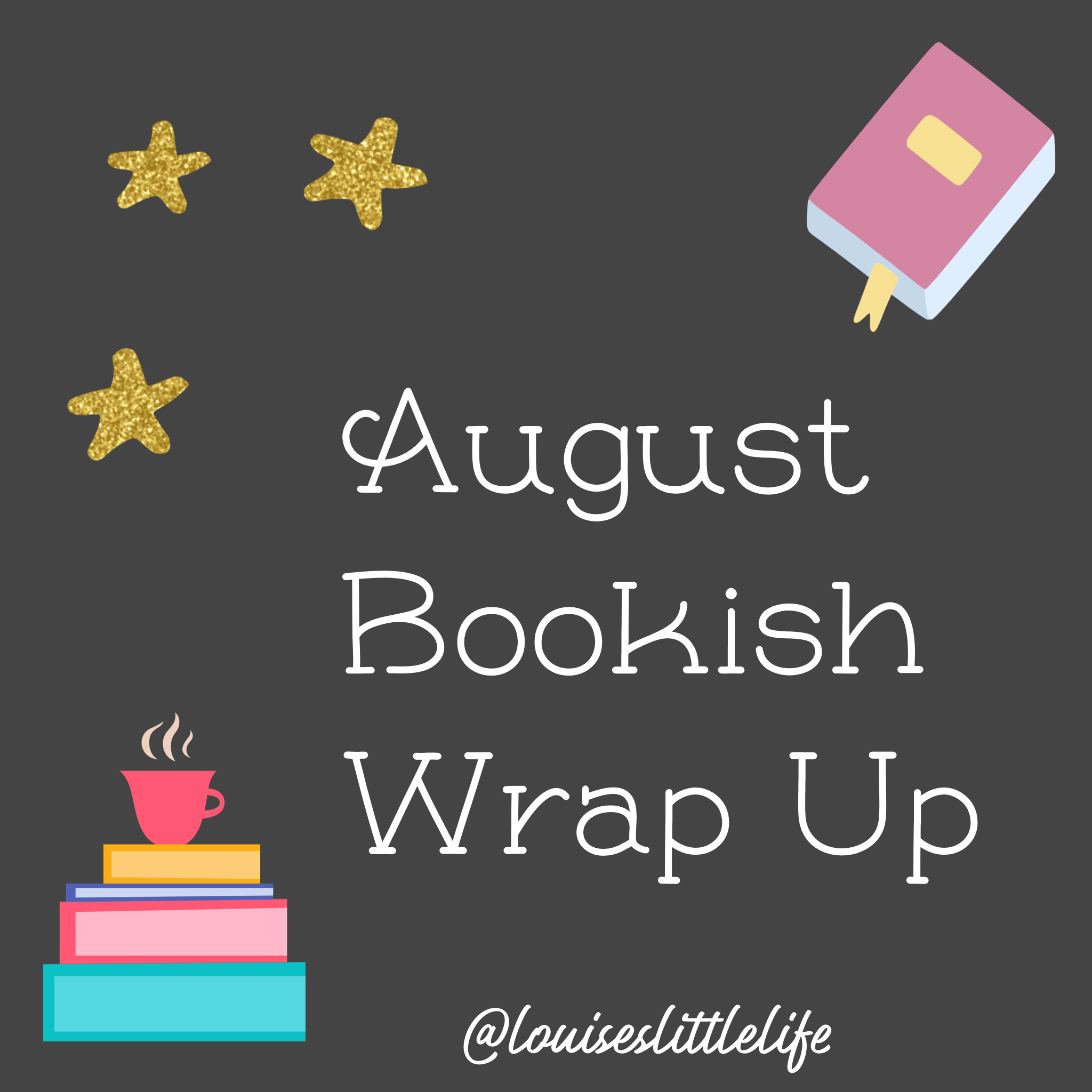 ID: Graphic with a grey background. The words August Bookish Wrap Up are in the centre and surrounding them is a picture of some books, a cup of tea and some gold stars