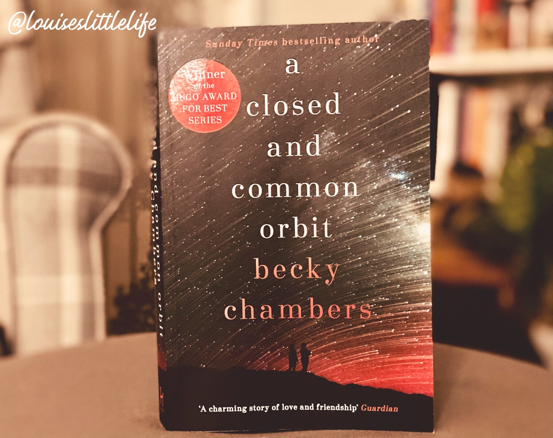 ID: The book A Closed and Common Orbit by Becky Chambers. The book has two silhouetted people looking at the vast night sky on the cover.