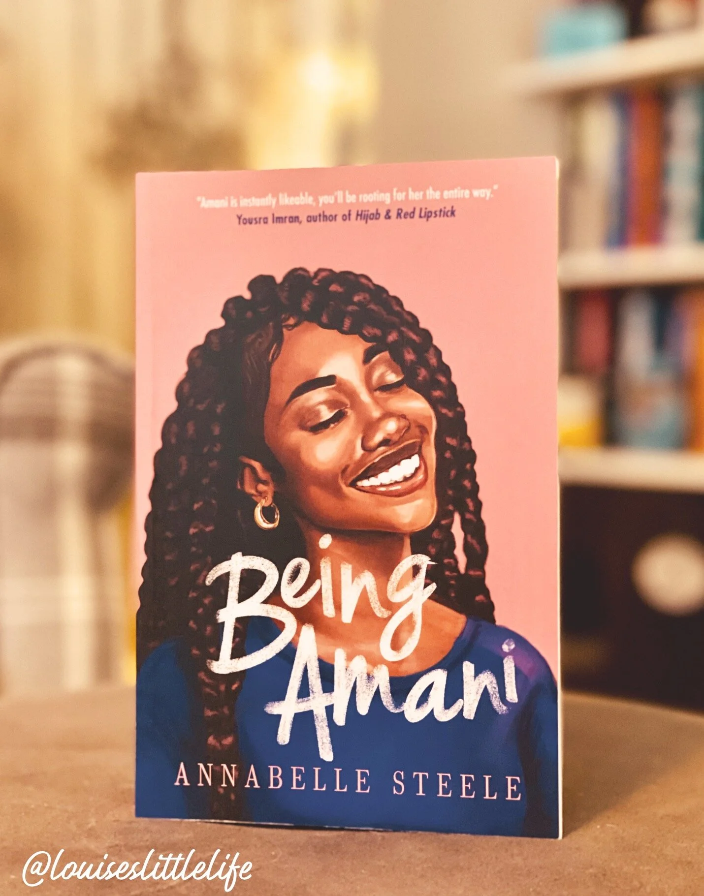 ID: The book Being Amani by Annabelle Steele. The book has a pink cover with an illustration of a black girl, Amani, smiling.