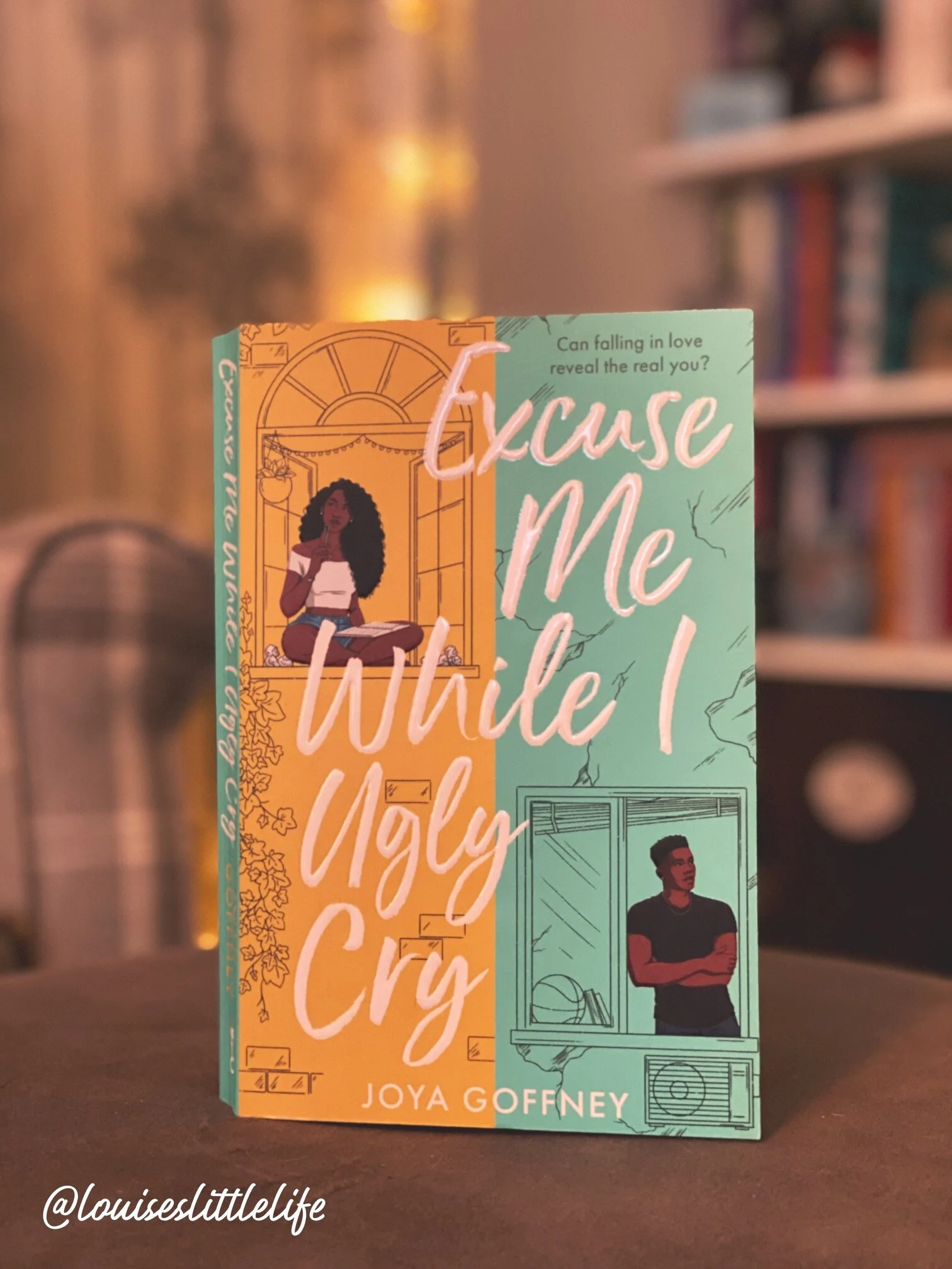 ID: The book Excuse Me While I Ugly Cry by Joya Goffney. The book has a blue and yellow cover with an illustration of a black teenage girl in the top left corner and a black teenage boy in the bottom right.