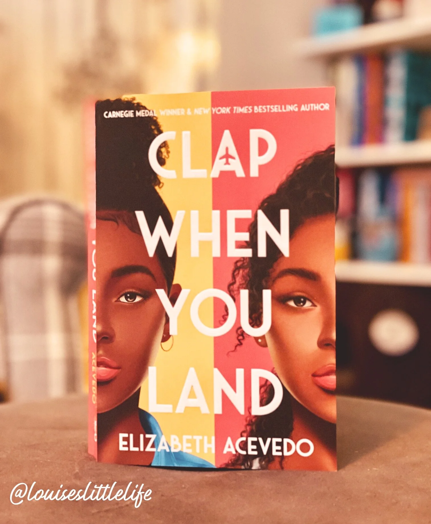 The book Clap When You Land by Elizabeth Acevedo. The book has a pink and yellow cover with two black teenage girls on it. You can only see half of each girl’s face ~ one on the right and one on the left.