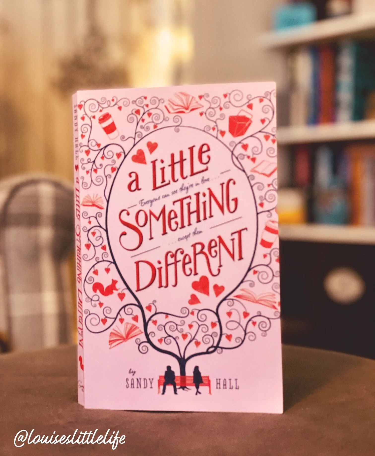 ID: The boo A Little Something Different by Sandy Hall. The book has a pink cover with an illustration of a man and woman sat on a bench at the bottom with lots of little pictures of items relating to the story itself.