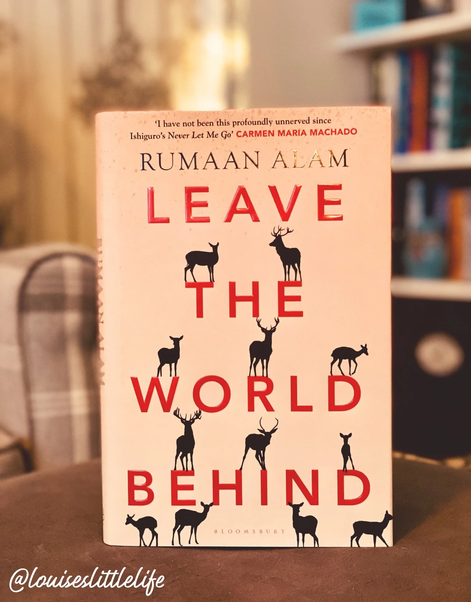 ID: The book Leave The World Behind by Rumaan Alam. The book has a pale creamy/pink cover with illustrations of deer in silhouette. The title is written in red.