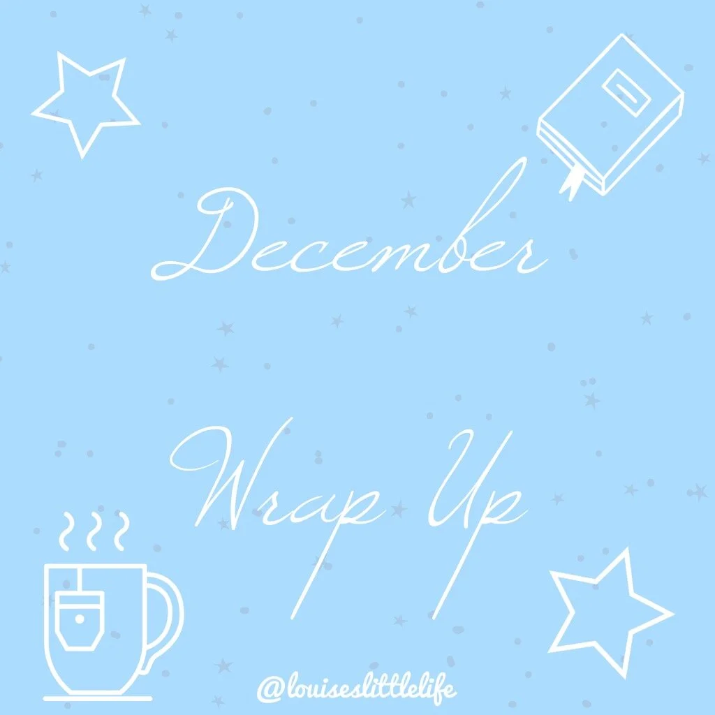 ID: Graphic with a light blue background and the words December Wrap UP written in the middle in white. There are stars, a cup and a book surrounding the writing.