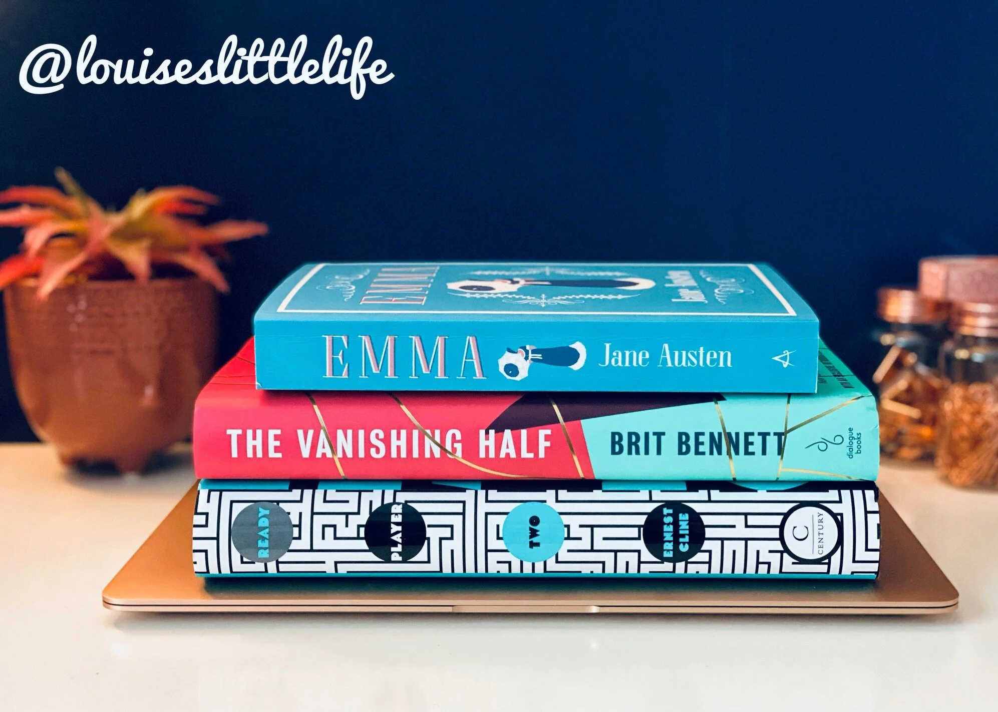 ID: A stack of 3 books, Emma by Jane Austen, the vanishing Half by Brit Bennett and Ready Player Two by Ernest Cline
